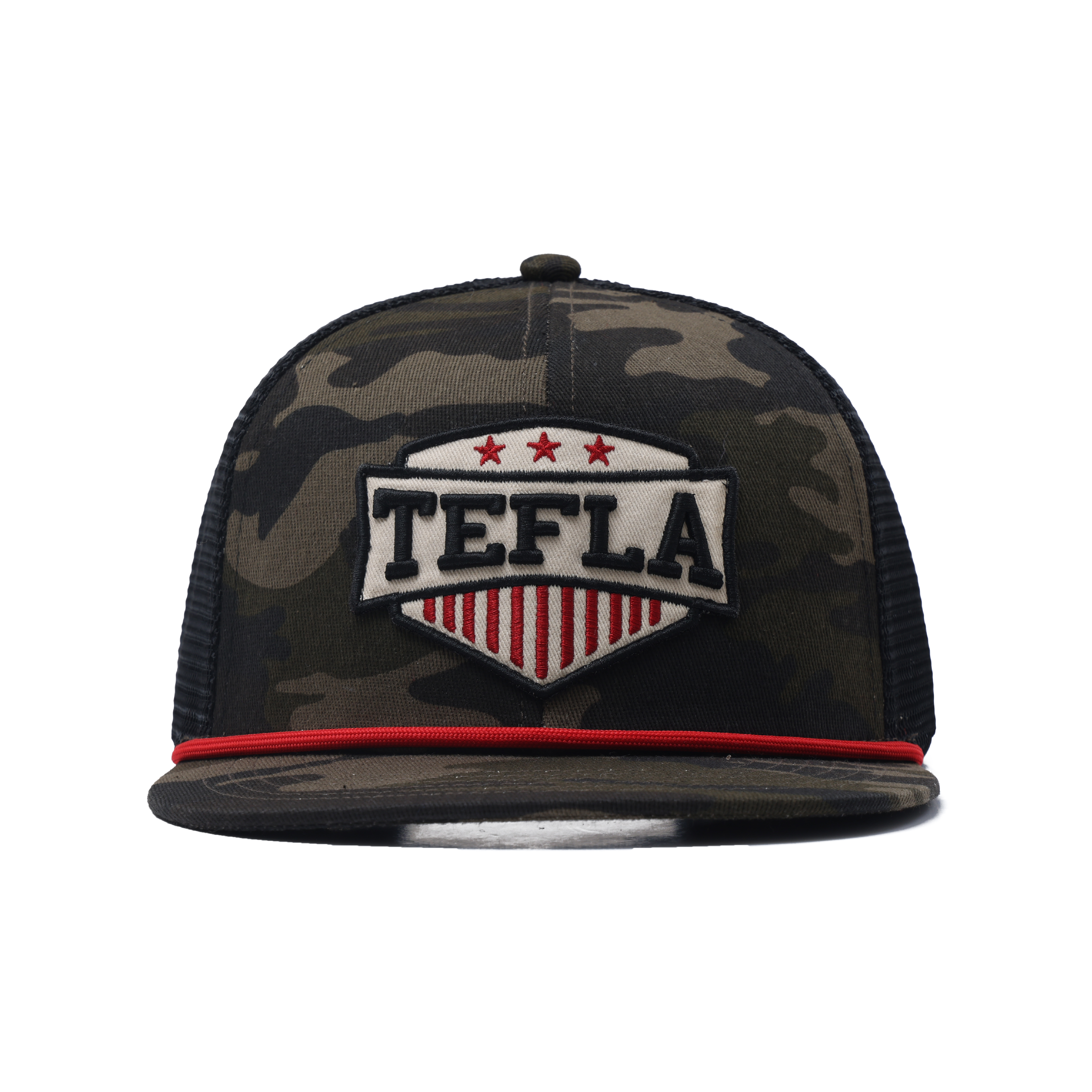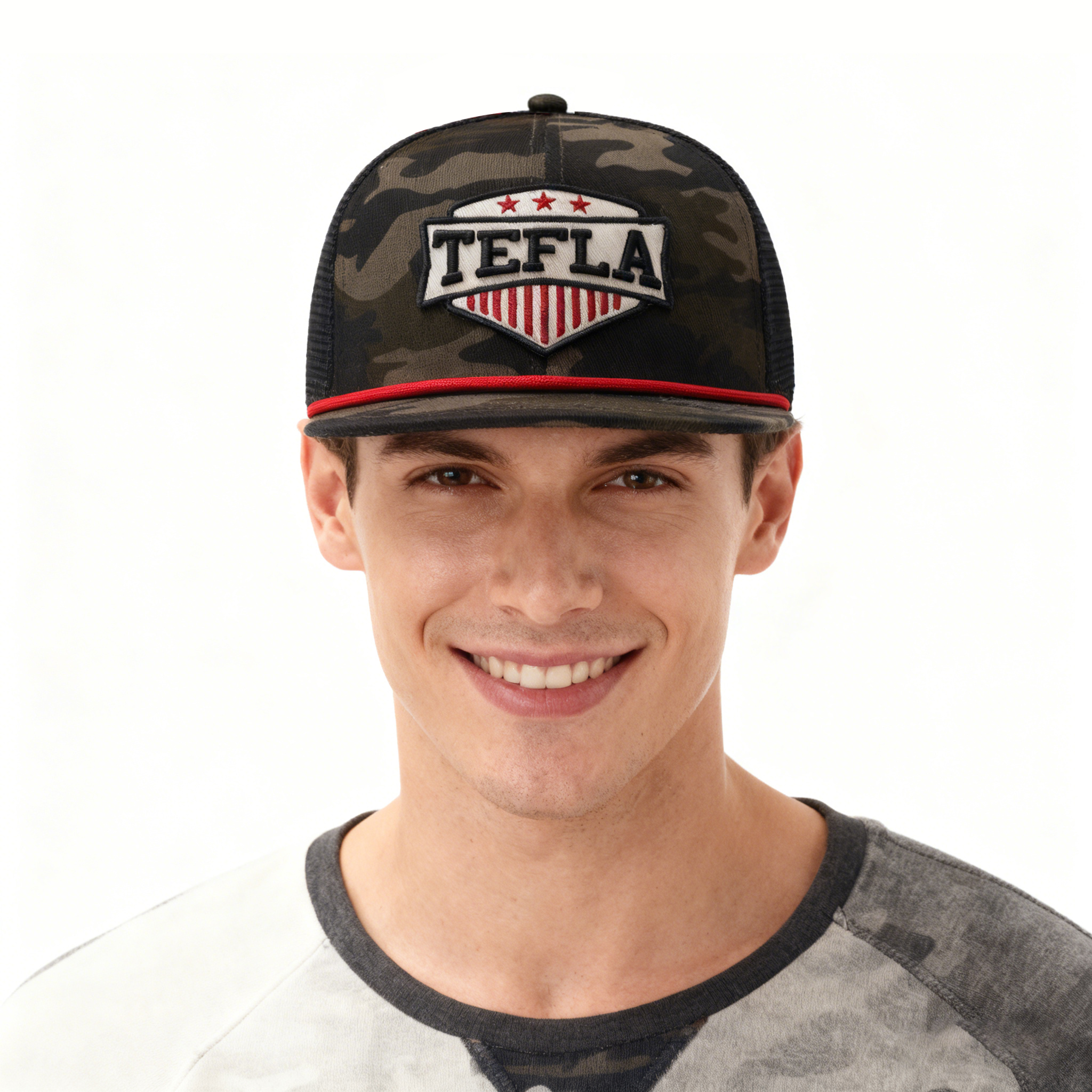 Mit einer 6-Panel-strukturierten Krone und einer flachen Krempe verbindet dieser Hut urbane Streetwear-Ästhetik mit praktischem Design. Das Tarnmuster sorgt für eine robuste Optik, während das auffällige TEFLA-Logo die Markenidentität unterstreicht und es zu einer vielseitigen Ergänzung für Modekollektionen, Lifestyle-Produkte und Werbekampagnen macht.